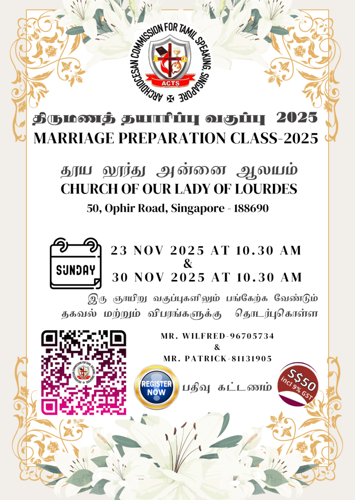Are you or your friends getting married in any part of India? All Indian Catholics working overseas must attend the Marriage Preparation Course and get the Certificate. We (ACTS) are conducting Marriage Preparation Courses in Tamil for all those who are working in Singapore. Please make use of this opportunity and attend asap.